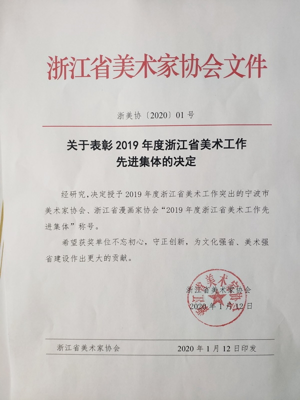 1月12日,2020年浙江省美术家协会工作会议在浙江展览馆召开。我市美术家协会与浙江省漫画家协会获得了2019年度浙江省美术工作先进集体称号,浙江省文联主席、浙江省美协主席许江和浙江省文联副主席、书记处书记赵雁君为获奖单位代表颁奖。