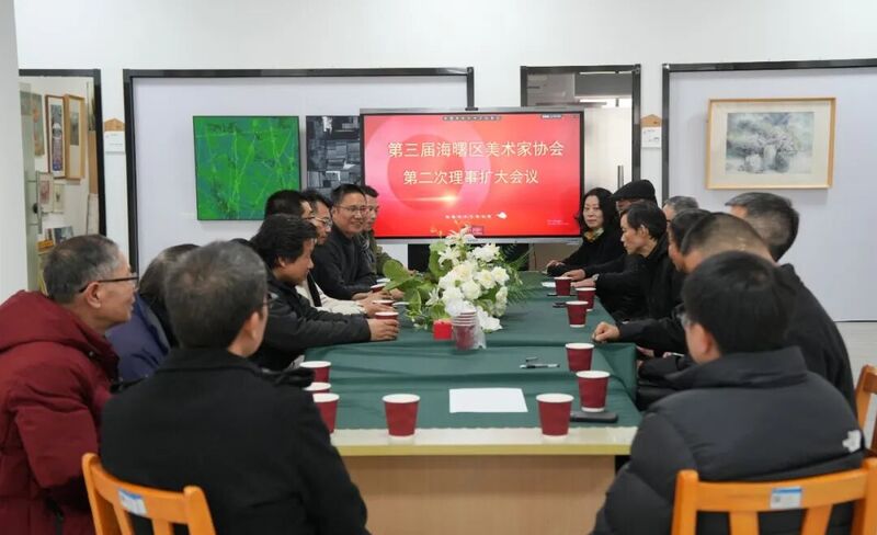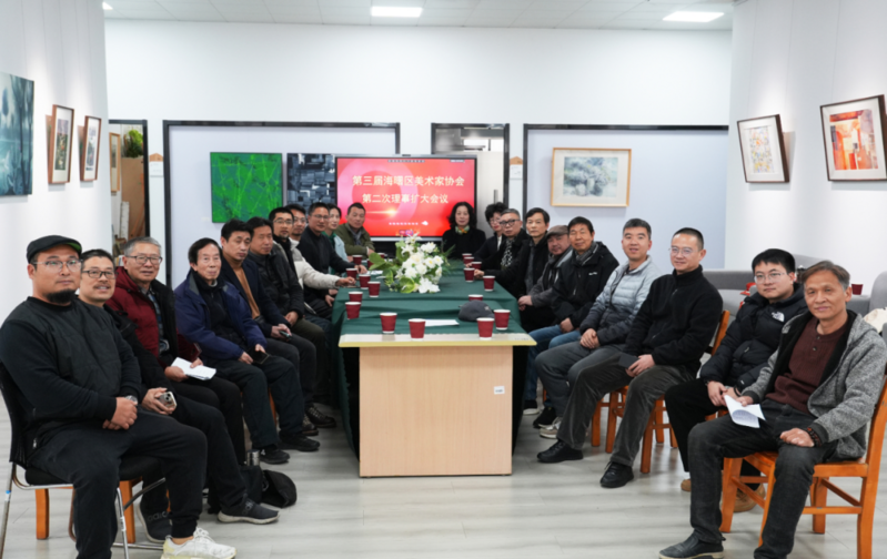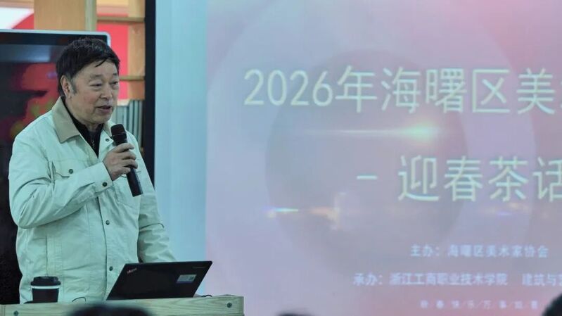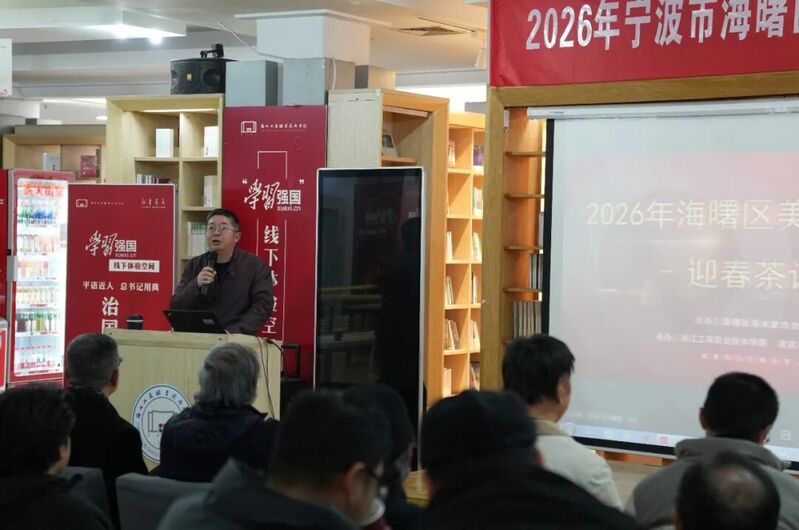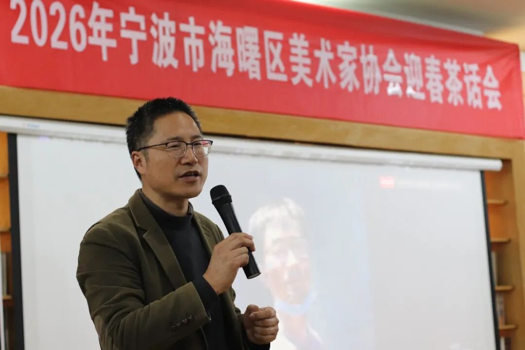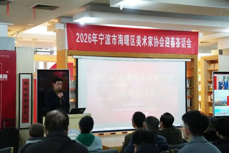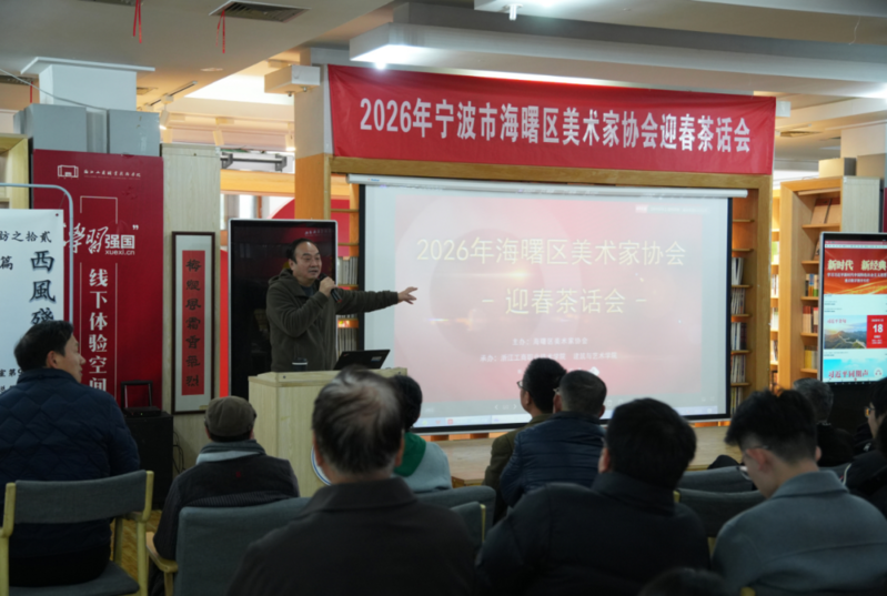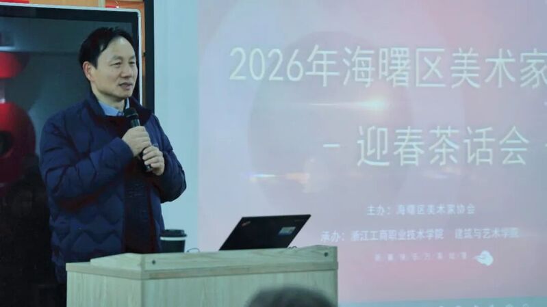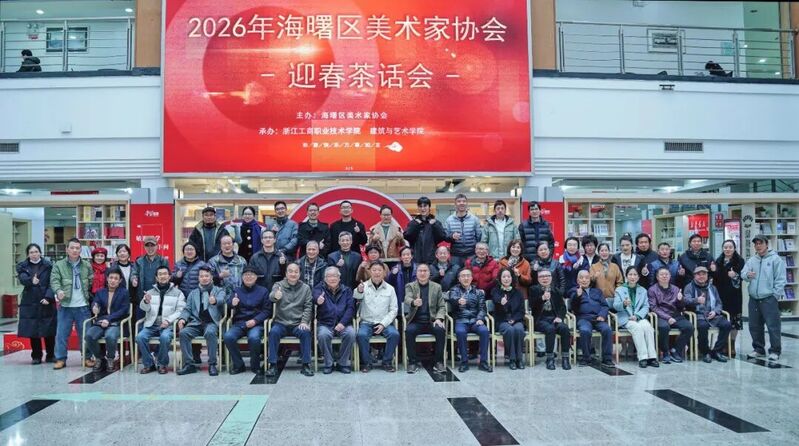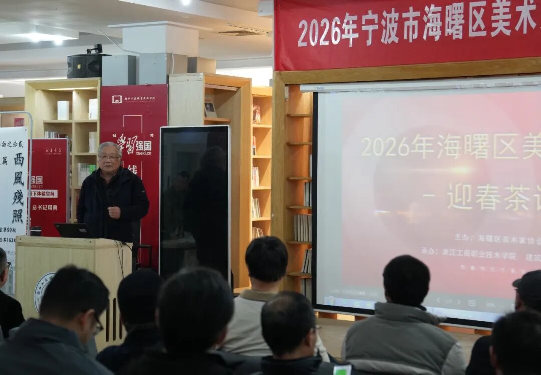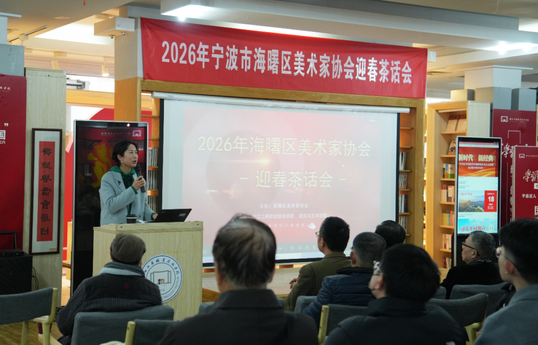 2026年1月18日下午,海曙区美术家协会理事会议暨迎春茶话会在浙江工商职业技术学院图书馆隆重举行,全区美术界代表欢聚一堂,共话艺术发展,喜迎新春佳节。浙江工商职业技术学院建筑与艺术学院院长徐健民,区美协名誉主席林绍灵,区美协顾问韩培生、李建新,资深室内建筑师王明道教授等嘉宾应邀出席。会议由海曙区美协秘书长陈伟杰主持。