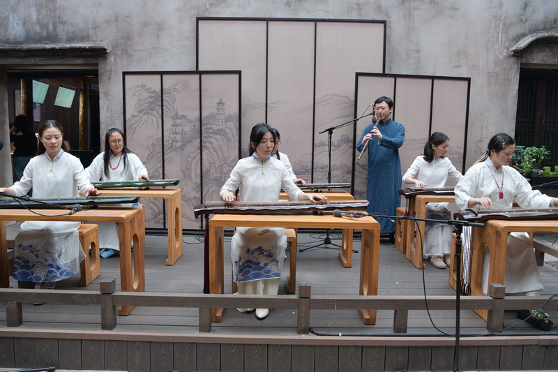 下午,紫阳街大书场座无虚席,“甬临民乐雅集”正式拉开帷幕。在主持人的引导下,11个精心编排的节目次第登场,涵盖独奏、齐奏、重奏等多种形式,尽显民乐魅力。宁波、临海两地古琴演奏员联袂带来的古琴齐奏《关山月》,开篇便以苍劲悠远的旋律勾勒出边塞壮阔意境。宁波与临海演奏家合作的古琴与手碟二重奏《酒狂》,传统丝弦与现代打击乐碰撞,演绎出别样狂放洒脱。宁波琵琶学会独奏的《龙船》惊艳四座,琴箫合奏《梅花三弄》清雅高洁,古琴曲《秋江夜泊》意境悠远。临海民乐演奏家们的民乐重奏《铁血丹心》《九州同》将经典旋律与民乐特色结合,气势恢宏。宁波古琴学会会长与琵琶学会会长两位国家一级演奏家联手的古琴琵琶二重奏《春江》,再现了“春江潮水连海平”的唯美古意,琴曲《良宵引》琴音温润,尽显月夜静谧。值得一提是傅丹老师创作的琵琶乐舞作品《秋水夕照》,该曲已被收入国内百首琵琶名曲,现场由她与临海籍大弟子、宁波琵琶学会会长叶晓红共同演绎,二级舞蹈家周艳伴舞。动听的乐声与曼妙的舞姿相融,宛如流动的秋日诗画,将雅集活动推向了高潮。最后,宁波、临海两地琵琶演奏员齐奏《欢乐的日子》,用欢快旋律为雅集画上圆满句号。